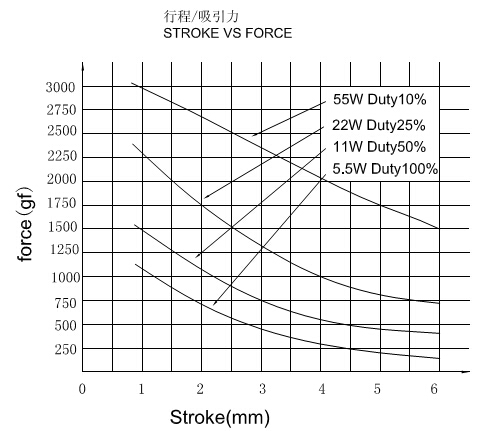 縱向:代表電磁鐵在對(duì)應(yīng)行程時(shí)的力量 單位為克(g)